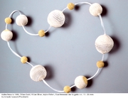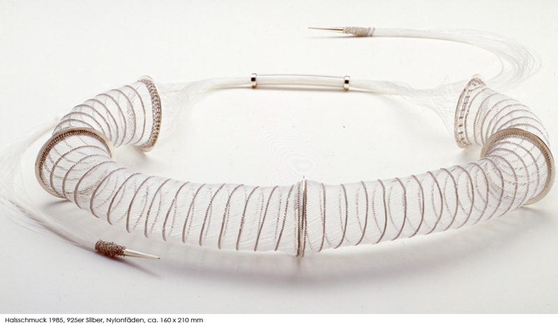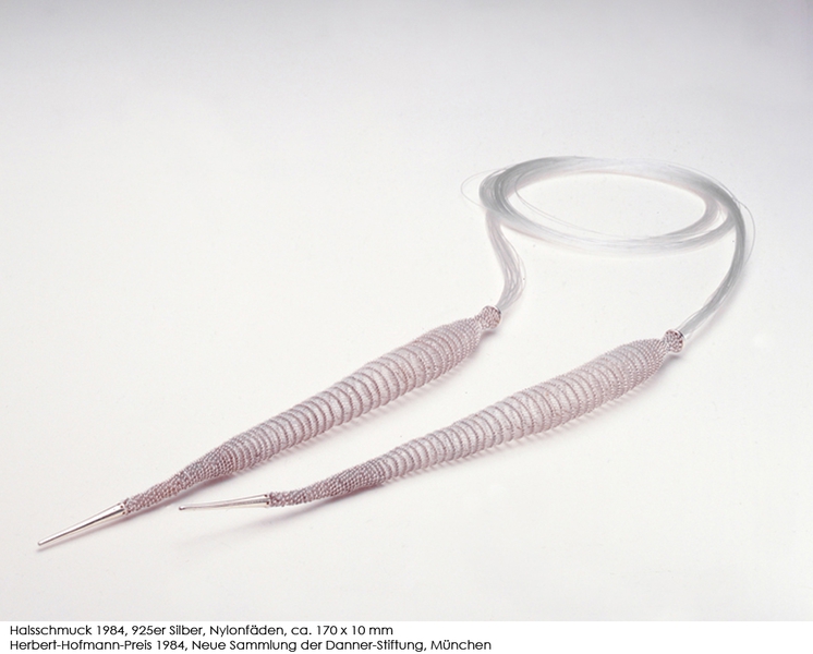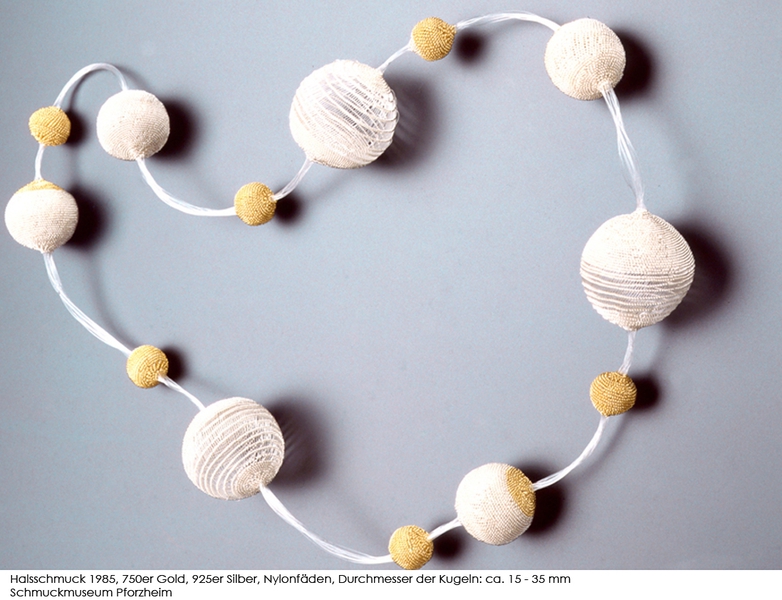 Gold-, Silber- und Nylonfäden, die sie zu netzartigen Hals- und
